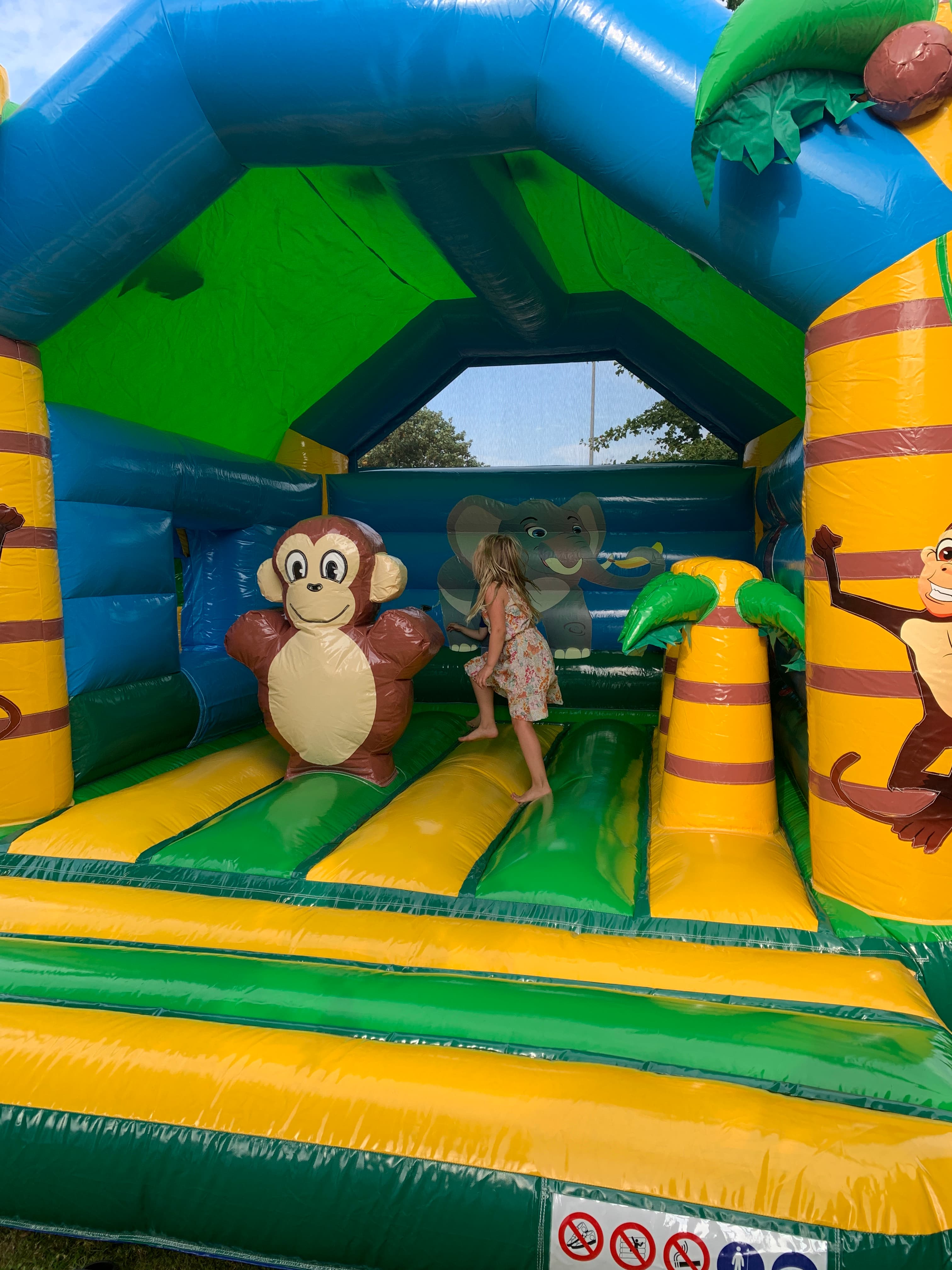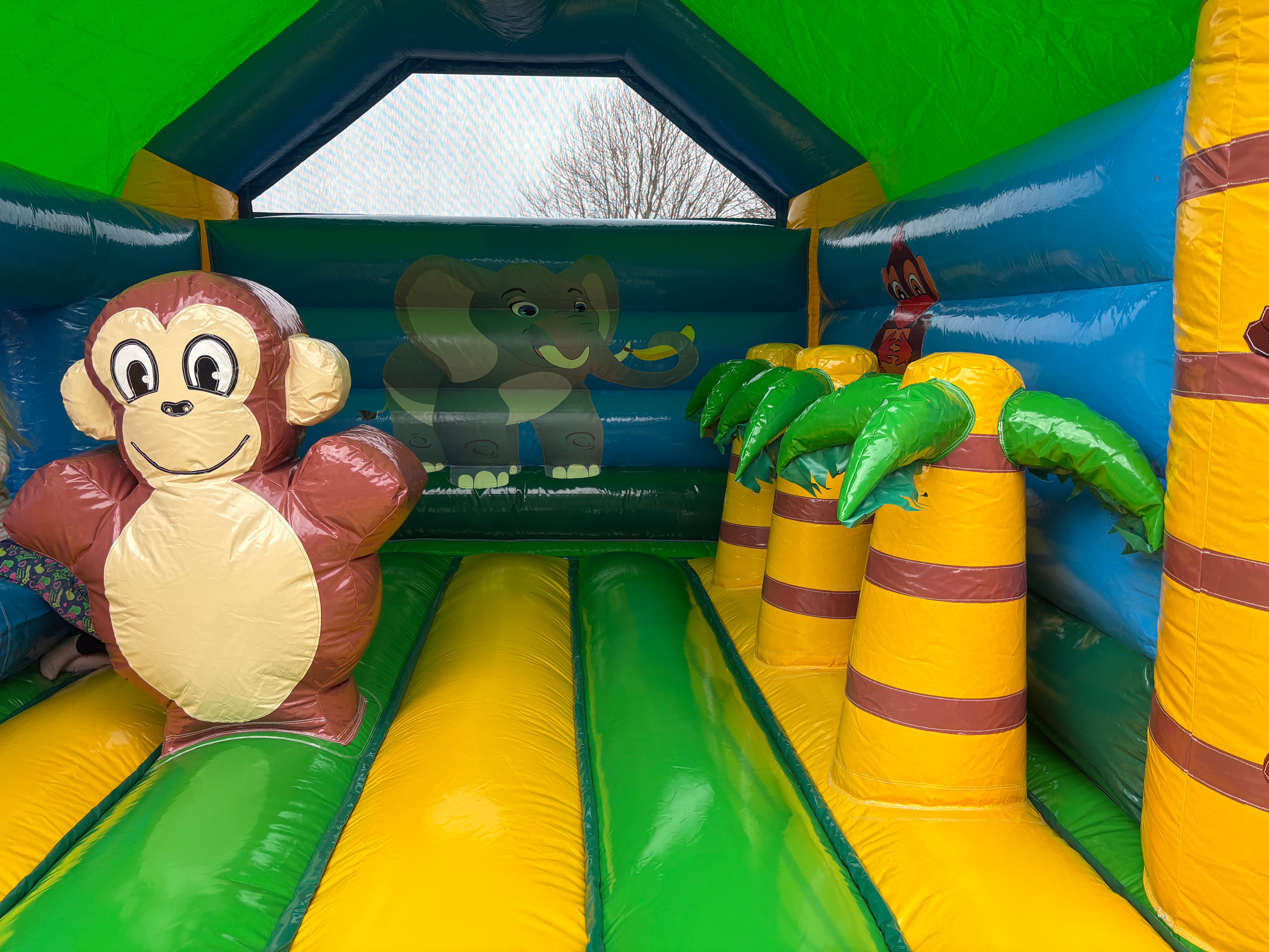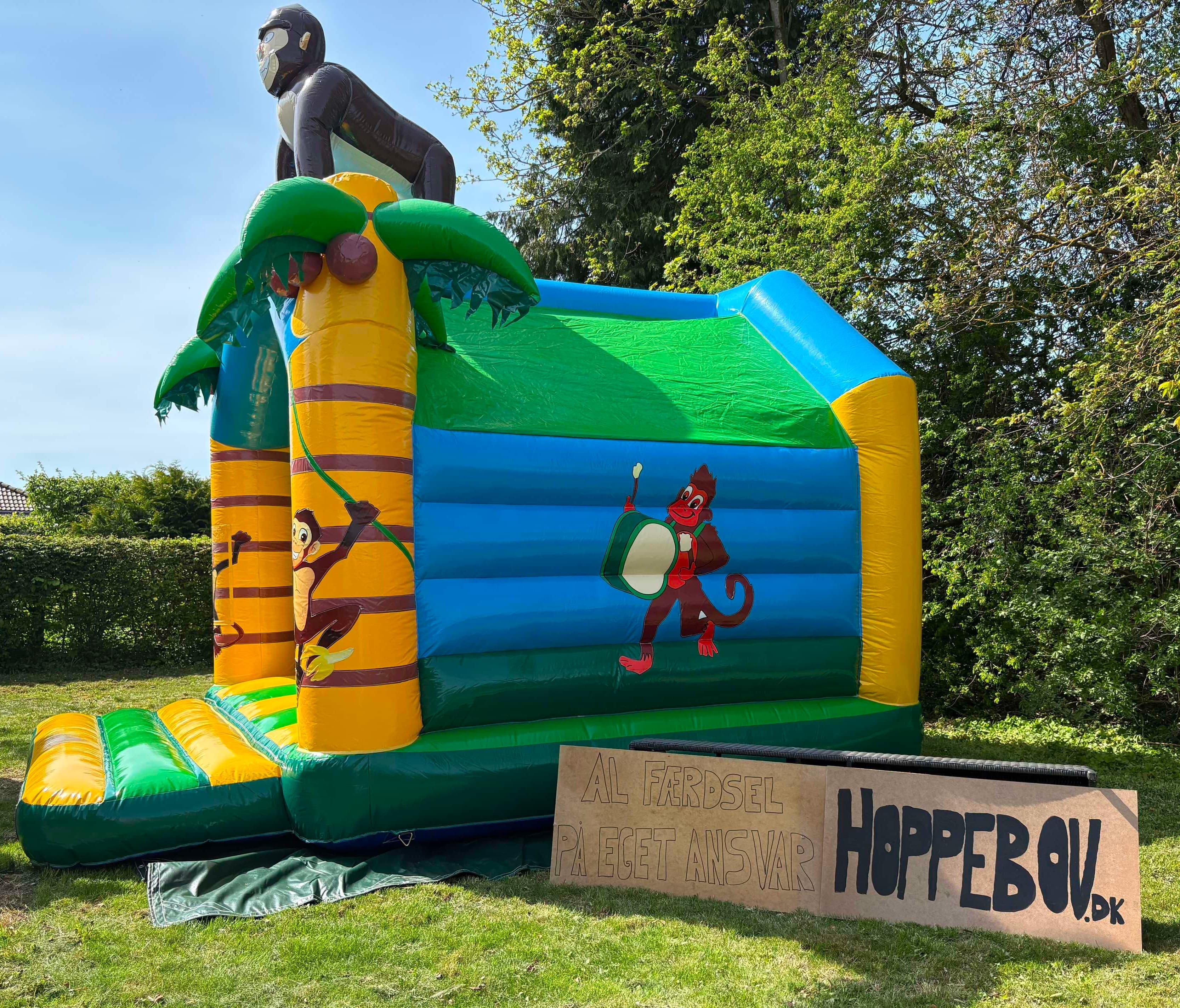 Vores hoppeborg er farverig og jungle-tematiseret med rutsjebane, palmer og dyr, der skaber en sjov oplevelse for børnene. Den er ideel til fødselsdage, fester og arrangementer.